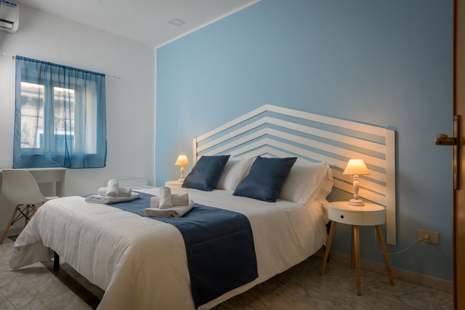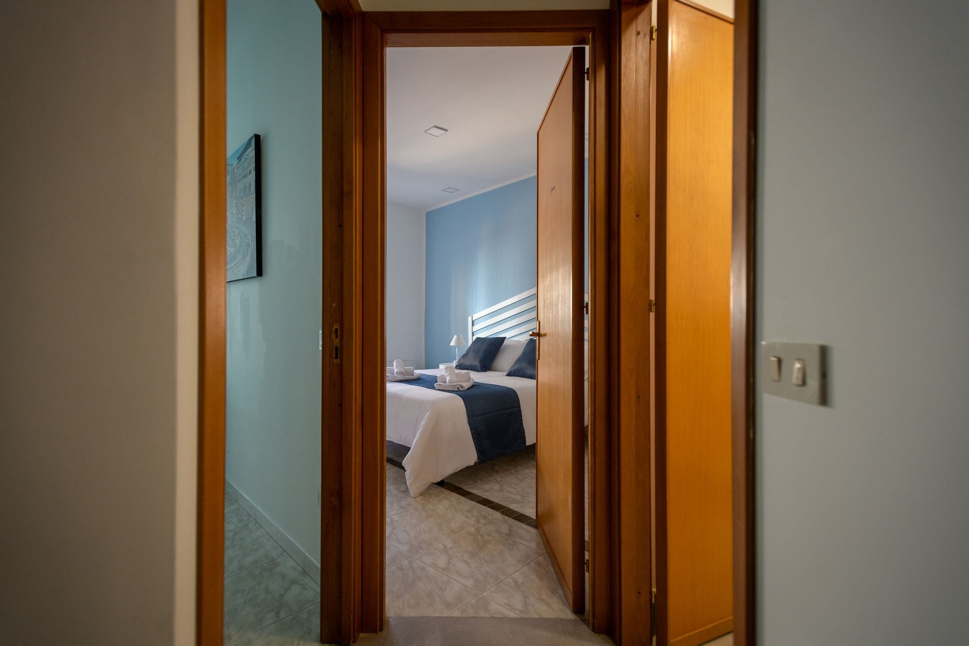 Le due camere matrimoniali sono allestite con letto in materasso memory e quattro diversi guanciali, guardaroba appendiabiti, condizionatore caldo/freddo, console e poggia valigia.